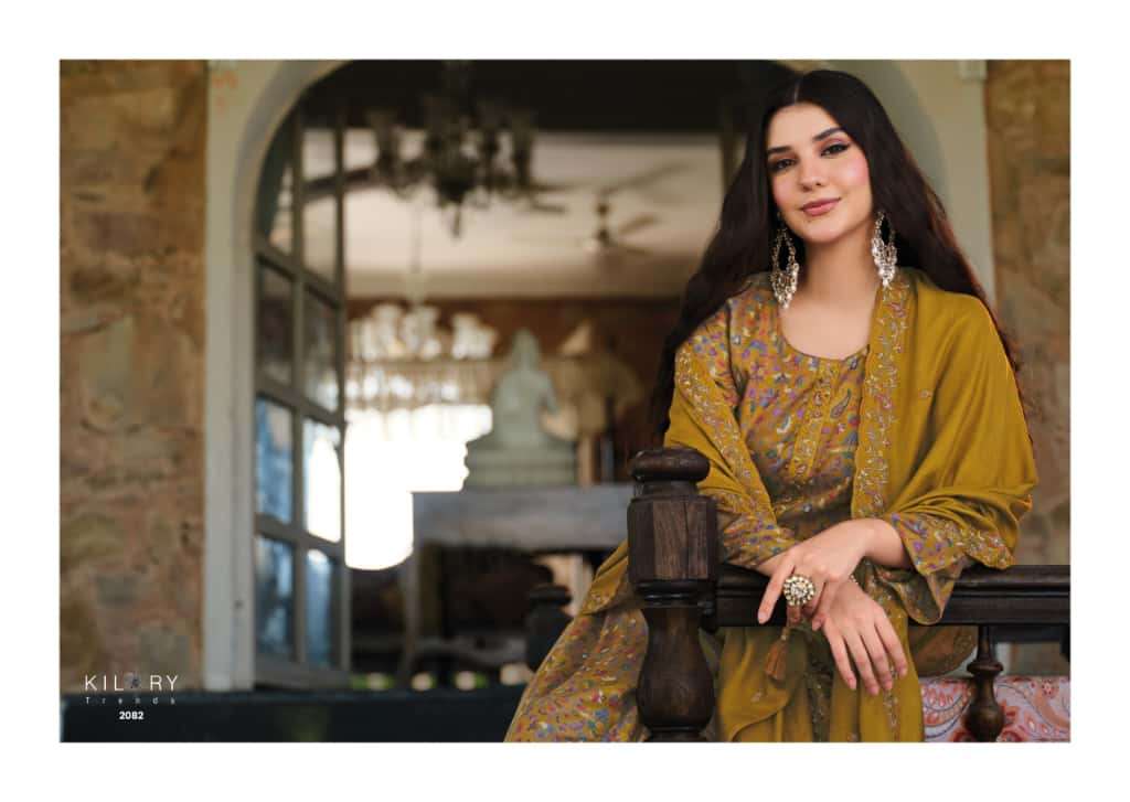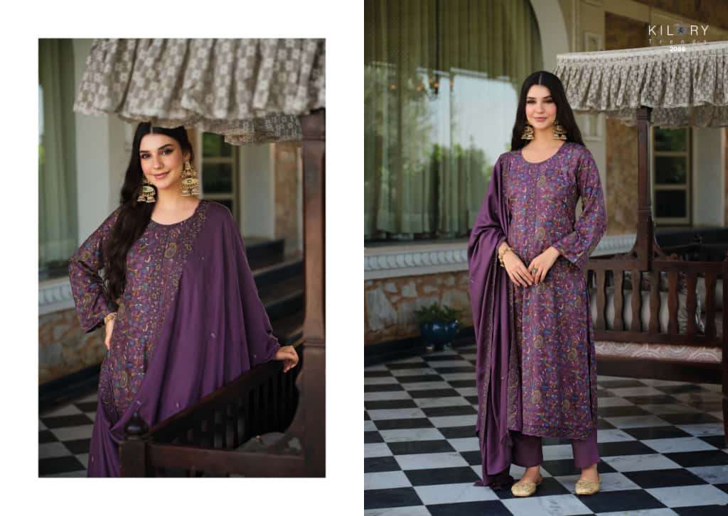 | Top: | pure viscose pashmina digital foil print with neck & daman embroidery* |